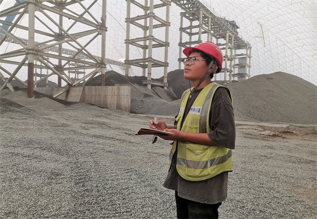 到达二工区生产区域中细碎车间外,一名皮肤黝黑、身材高挑、戴着副大眼镜的年轻小伙儿迎了上来,向大家表示欢迎,他就是工区安排的讲解员。小伙儿带领大家边走边看,从中细碎车间到筛分车间,再进入气膜仓,边解说边回答大家的问题。从设备的运行规程,到骨料的各种参数,小伙儿如数家珍对答如流。