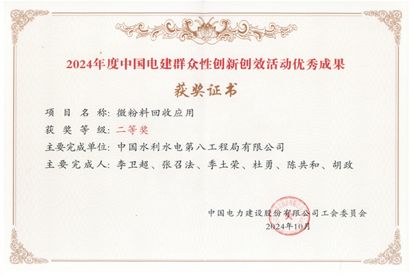 微粉料回收应用获奖证书
